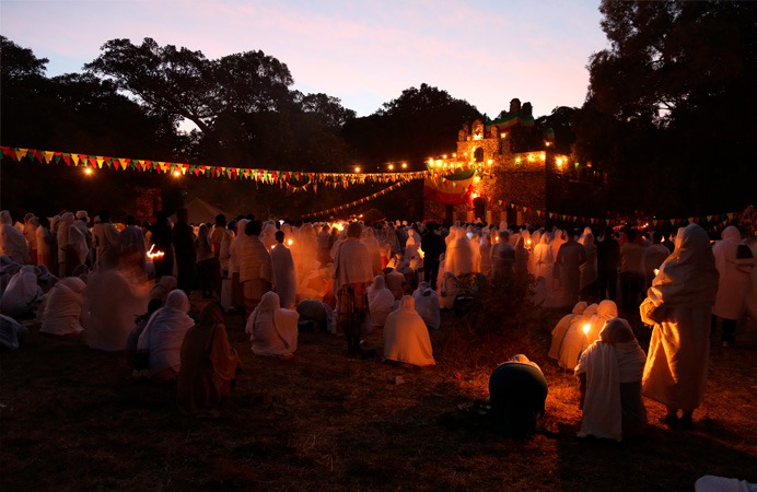 Pensión completa. Temprano asistiremos a la fascinante Celebración de MILEHLA: antes del alba el “Tabot” es llevado en procesión y todos los fieles que le siguen llevan una vela creando una atmósfera mágica. Los cantos y la litúrgia dura hasta pasadasas las 7 de la mañana. Traslado al aeropuerto para salir a las 12:10 en vuelo con destino a Gondar. Llegada a las 13:50 y visita de Gondar, cuyos Castillos son Patrimonio de la Humanidad. Es un lugar tan mágico que incluso J.R.R.Tolkien se inspiró en él para inventar Gondor “La ciudad de piedra” en élfico, en el contexto de El Señor de los Anillos. El más destacado es el Castillo de Fasiladas ( s.XVI), visita a los baños reales y la iglesia de Debre Birhan Sellasie, fundada en 1690, la única que quedó intacta tras el ataque de facciones sudanesas en 1888. Cuentan que cuando le iba a tocar el saqueo, un enjambre de abejas descendió del techo e intervino haciendo que las tropas enemigas salieran corriendo. Paralelamente, el Arcángel San Miguel protegió la puerta con su espada de fuego. La Ciudadela, erizada de castillos, es un ejemplo único de la particular arquitectura, el llamado “estilo de Gondar” (sobre una base local árabe se integran las influencias del estilo barroco europeo, introducido por los misioneros portugueses). Alojamiento. MAYLEKO H. 4*